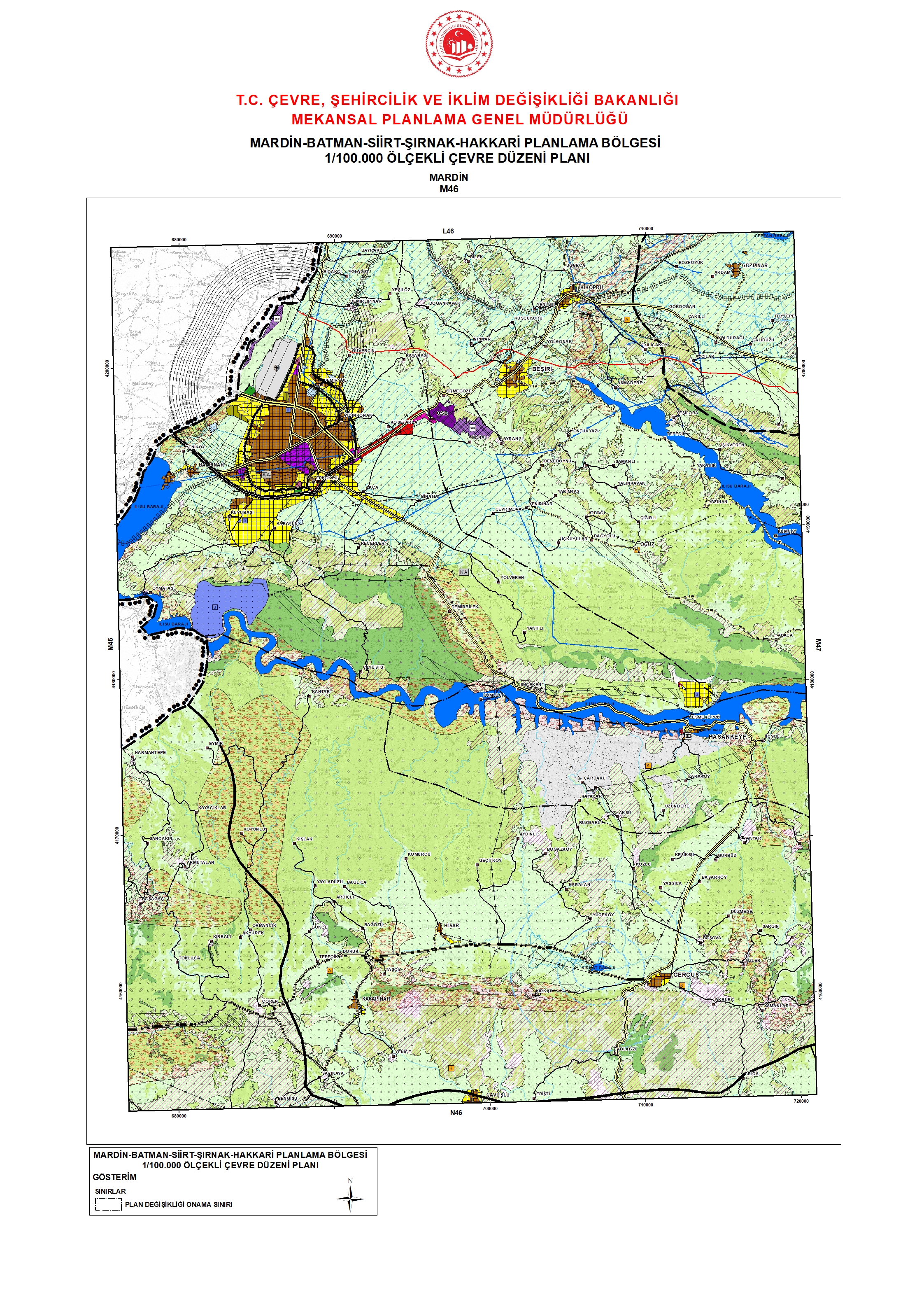 644 sayılı Çevre ve Şehircilik Bakanlığı’nın Teşkilat ve Görevleri Hakkında Kanun Hükmünde Kararname’nin 7.maddesi uyarınca “Mardin-Batman-Siirt-Şırnak-Hakkari Planlama Bölgesi 1/100.000 Ölçekli Çevre Düzeni Planı Değişikliği” (N46 Plan Paftası, Plan Değişikliği Raporu) 25.01.2018 tarihinde Bakanlığımızca onaylanmıştır.