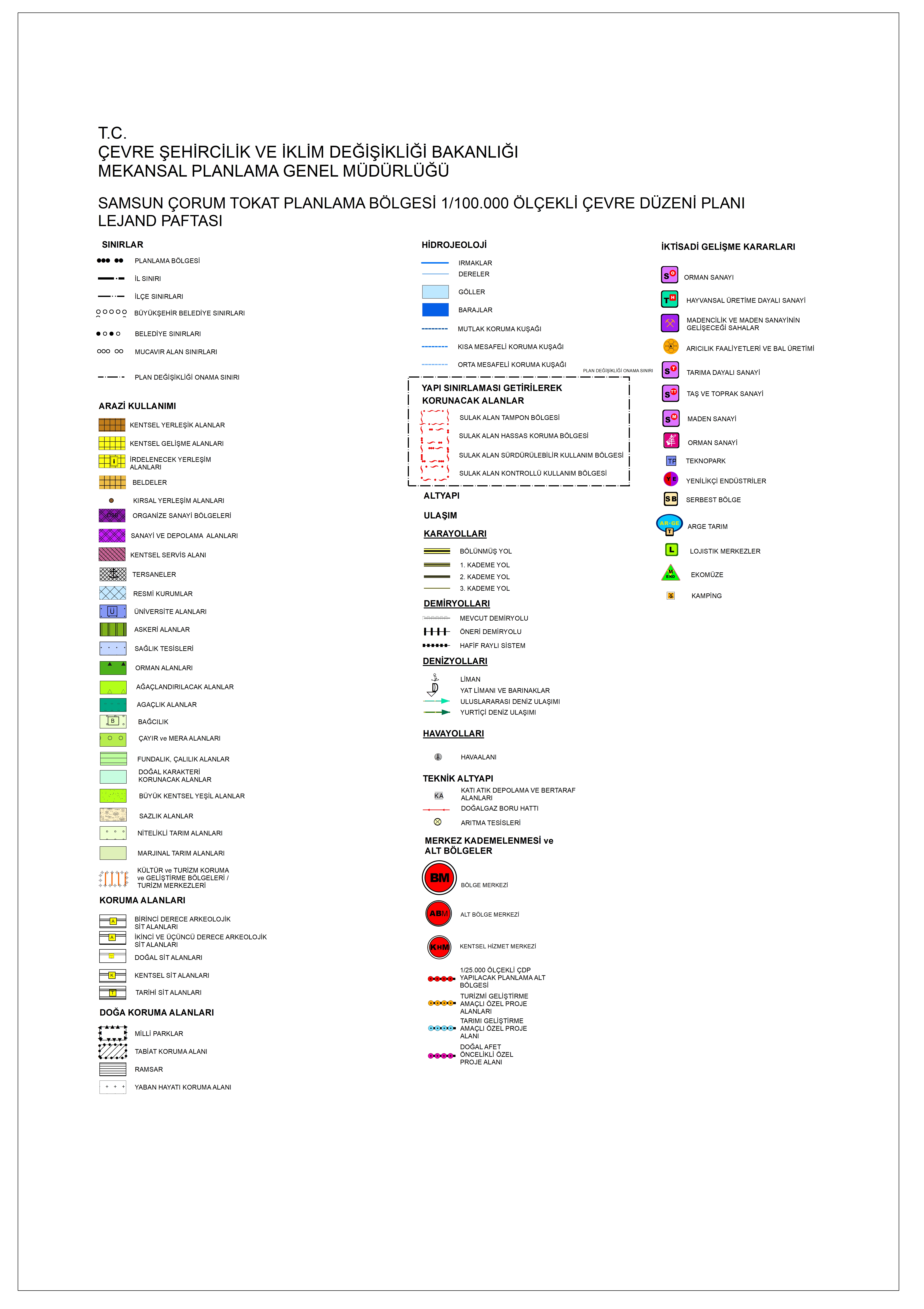 TC Çevre ve Orman Bakanlığı tarafından 20.07.2007 tarihinde onaylanan ve askı sonrasında 26.02.2008 tarihinde kesinleştirilen Samsun-Çorum-Tokat Planlama Bölgesi 1/100.000 Ölçekli Çevre Düzeni Planı’nın 1.5.17.7, 1.5.17.9, 1.5.17.12, 1.5.17.13, 1.5.17.14, 1.5.29.3 ve 1.5.29.4 nolu Plan Hükümlerinde Bakanlığımızca uygun görülen değişiklikler 11.11.2008 tarihli ve 27051 sayılı Resmi Gazete’de yayımlanan Çevre Düzeni Planlarına Dair Yönetmelik, 4856 sayılı Kanunun 2(h) ve 10(c) maddeleri ile 2872 sayılı Kanunun 9(b) maddesi uyarınca 24.06.2011 tarihinde onandı.